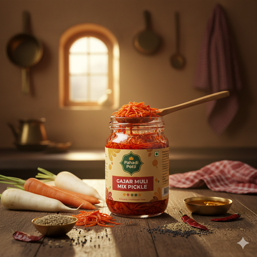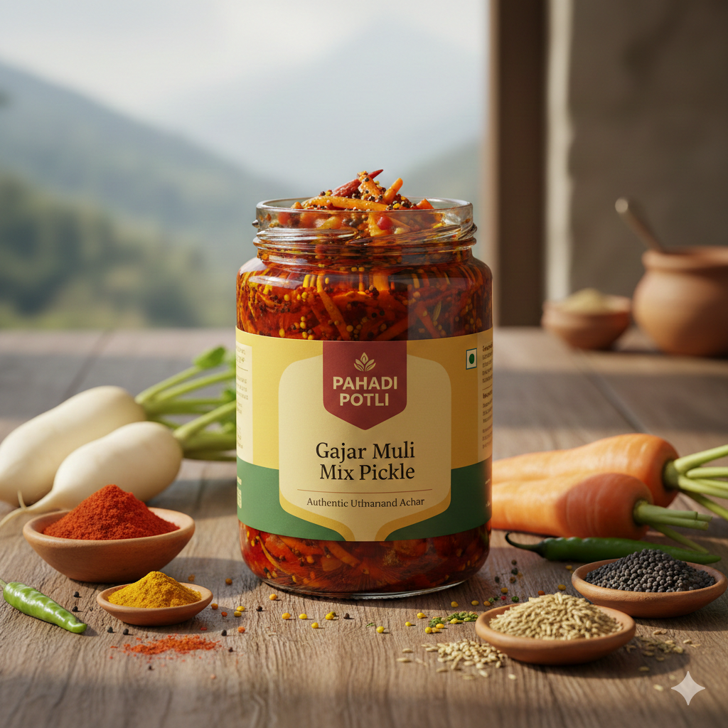 Gajar Muli Mix Pickle captures the hearty flavors of Uttarakhand winters, where fresh seasonal carrots and radish are transformed into a crunchy, tangy-spicy achar that warms every meal. Made with locally grown gajar and muli pieces, this mixed vegetable pickle is coated in a robust blend of traditional spices and matured in mustard oil to develop its signature bold taste. Winter mix pickles like this are beloved across North India for their satisfying crunch and ability to elevate simple cold-weather meals.